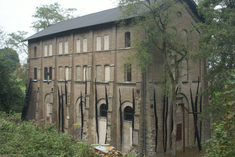 Aan de linkerzijde het gebouw Augustaschacht ( Arbeitserziehungslager ) waar de dwangarbeiders werden ondergebracht. De verkoolde boomstammen die werden bevestigd aan het gebouw behoren tot het kunstwerk van de Duitse kunstenaar Volker Trieb. Mahnmal is een Duits woord met ongeveer de betekenis : waarschuwend of vermanend monument. Het is een combinatie van mahnen ( vermanen, waarschuwen ).