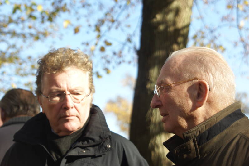 Dr. Klaus Lang in gesprek met Jules Schenck de Jong bij de vijver in Georgsmarienhütte waar hij tot zijn middel in het water moest werken onder erbarmelijke omstandigheden.