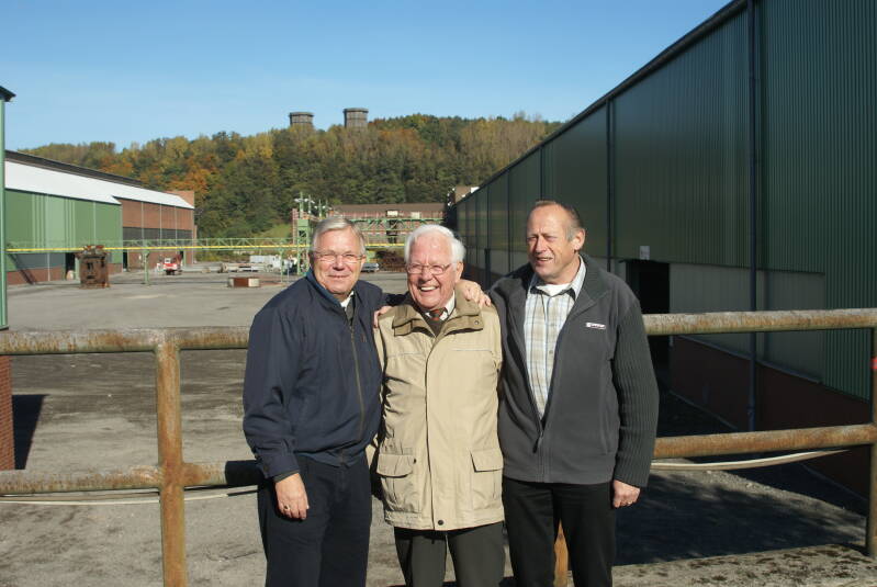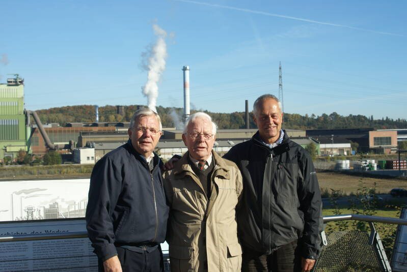 Van rechts naar links Dr Volker Issmer, de heer Piet Hofstra en Hendrik Willem Gaertman Jr. Op de achtergrond de fabrieken van Klöckner Werke in Georgsmarienhütte waar de 5 hoogovens hebben gestaan waar de dwangarbeiders, waaronder de heer Piet Hofstra en mijn vader, onder verschrikkelijke omstandigheden met een pikhouweel moesten werken.