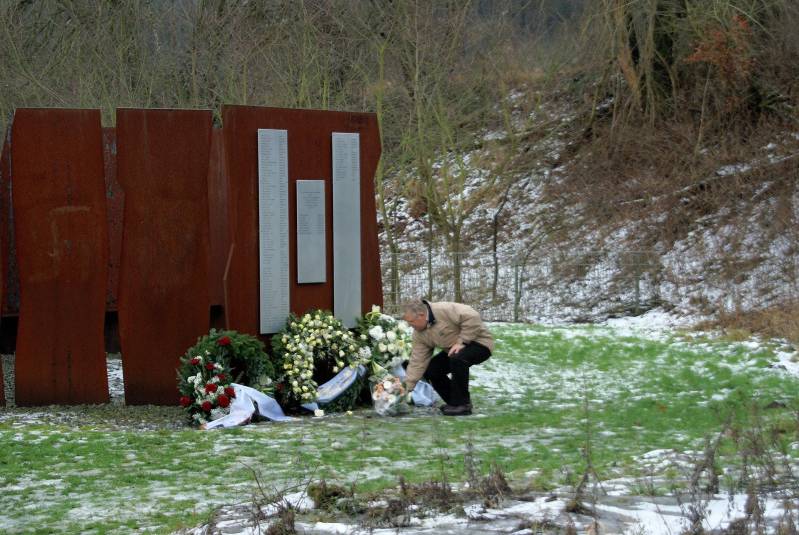 Bloemen bij het Mahnmal ontworpen door de kunstenaar Volker Trieb van de familie Gaertman
