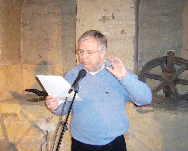 Die Rede, in der die Häftlingsmarke meines Vaters dem anwesenden Publikum gezeigt wurde. Diese Häftlingsmarke ist das einzige Exemplar, das von Herrn Mathijs Osthof unter Lebensgefahr aus dem Lager geschmuggelt werden konnte. Außerdem haben die Nazis alles zerstört. Rechts auf dem Foto Marie-Dominique Guyard-Griesinger Vorsitzende.