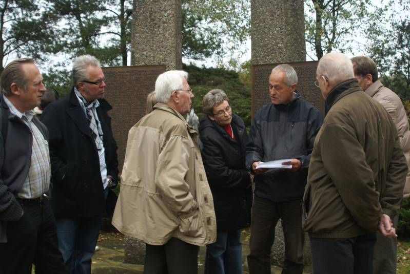 Uitleg van Dr. Volker Issmer bij het "Auslanderfriedhof" Meyerhöfen bij Bohmte. Ook hier liggen talrijke dwangarbeiders uit het Arbeitserziehungslager ( concentratiekamp ) Augustaschacht te Ohrbeck begraven.Op deze foto van links naar rechts mijn vriend Reyer van Kralingen ( overleden ), Rien Hofstra( zoon ) , Piet Hofstra ( overleden ), niet zichtbaar Nelly Rölker, Lea Schenck de Jong, Dr Volker Issmer ( overleden ) met rechts op de voorgrond Jules Schenck de Jong ( overleden ) en daarachter gedeeltelijk zichtbaar Michael Gander .