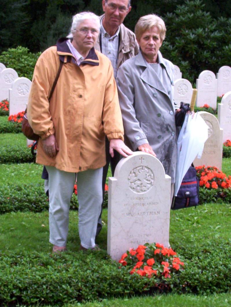 Bij het graf van Pa op het ereveld in Hannover van links naar rechts Tiny Gaertman-Blom, Henk Gaertman en Henny Wonink-Gaertman. Foto : Frits Wonink.