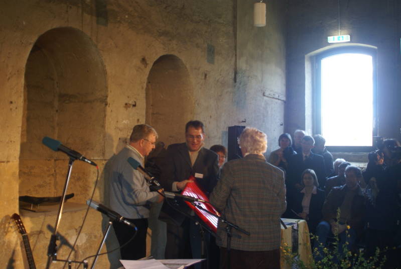 Bei der Eröffnung der Gedankstätte in Ohrbeck am 04.06.2008 übergibt Henny Wonink-Gaertman unser gemeinsames Geschenk der Familie Gaertman an Dr. Michael Gander der Geschäftsführer der Gedankstätte Augustaschacht. Von links nach rechts Hendrik Willem Gaertman (benannt nach seinem Vater), Michael Gander und Henny Wonink-Gaertman.
