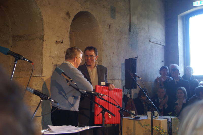 Henny Wonink-Gaertman overhandigt bij de Eröffnung der Gedankstätte te Ohrbeck op 6-4-2008 ons gezamenlijk cadeau van de fam. Gaertman aan Dr. Michael Gander de Geschäftsführer der Gedankstätte Augustaschacht. Van Links naar rechts Hendrik Willem Gaertman ( vernoemd naar zijn vader ) , Michael Gander en Henny Wonink-Gaertman.