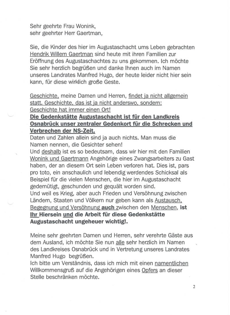 Het was de heropening van Augustaschacht en men had mij gevraagd een woordje te willen spreken. Kan ik dat vroeg ik mij af na zoveel ellende wat ons gezin was overkomen. Het moet werd er van boven gezegd! Na zoveel jaren moet er wel eens een keertje een stukje duidelijkheid komen. Het is goed dat te vertellen maar hoe? Vervolgens kreeg ik de ingeving om de Häftlingsmarke KW 1312, die mijn vader daar moest dragen, te tonen. De Häftlingsmarke was een metalen plaatje met een kettinkje wat om de hals moest worden gedragen. Dit is het enige plaatje dat uit het kamp is gekomen. Met gevaar voor eigen leven heeft Willem Mathijs Osthoff de Häftlingsmarke uit het kamp gesmokkeld. Het is het enige exemplaar daar de Nazi's de rest allemaal hebben vernietigd. Tot het moment dat er tijdens opgravingen in 2000 een plaatje van een dwangarbeider werd opgegraven, welk plaatje verwees naar de Häftlingsmarke van mijn vader. Bij die gelegenheid van de heropening van Augustaschacht had ik me speciaal gekleed in een hemelse lichtblauwe trui voor mijn gestorven vader naar wie ik ben vernoemd. Daarnaast hebben wij , namens de familie, een geschenk aangeboden in de vorm van een ets van A.W.Munster van de Maasbruggen te Rotterdam. Tijdens de tweede wereldoorlog is daar enorm gevochten. Ons geschenk hadden wij aangeboden in een rode verpakking , zijnde het symbool voor het vele vergoten bloed van de aldaar omgekomen dwangarbeiders in Augustaschacht. Er zaten vele Rotterdammers !