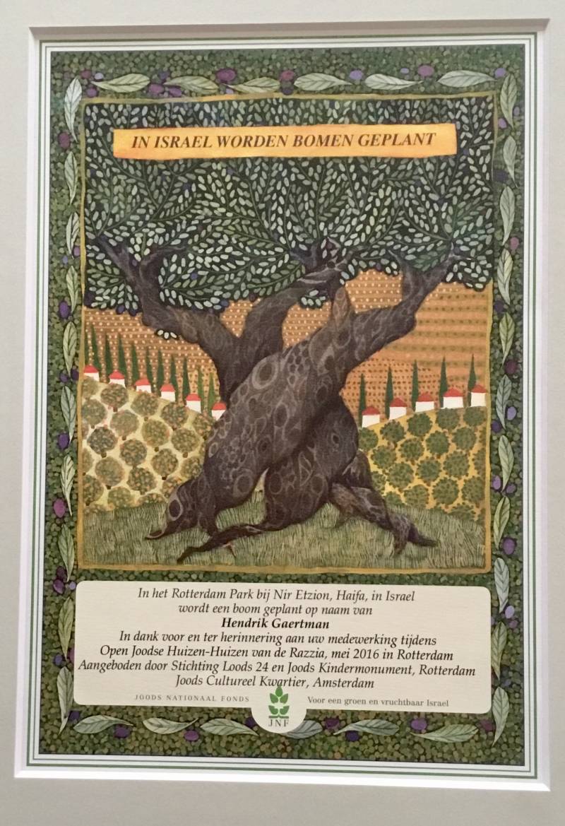 In dank voor en ter herinnering aan uw medewerking tijdens Open Joodse Huizen-Huizen van de Razzia, mei 2016 in Rotterdam.Aangeboden door Stichting Loods 24 en Joods Kindermonument, Rotterdam en Joods Cultureel Kwartier, Amsterdam. joods Nationaal Fonds ( JNF ) Voor een groen en vruchtbaar Israël.