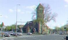 De Kruisvindingkerkm naast de luchtbrug die gaat naar het stadion Feyenoord.