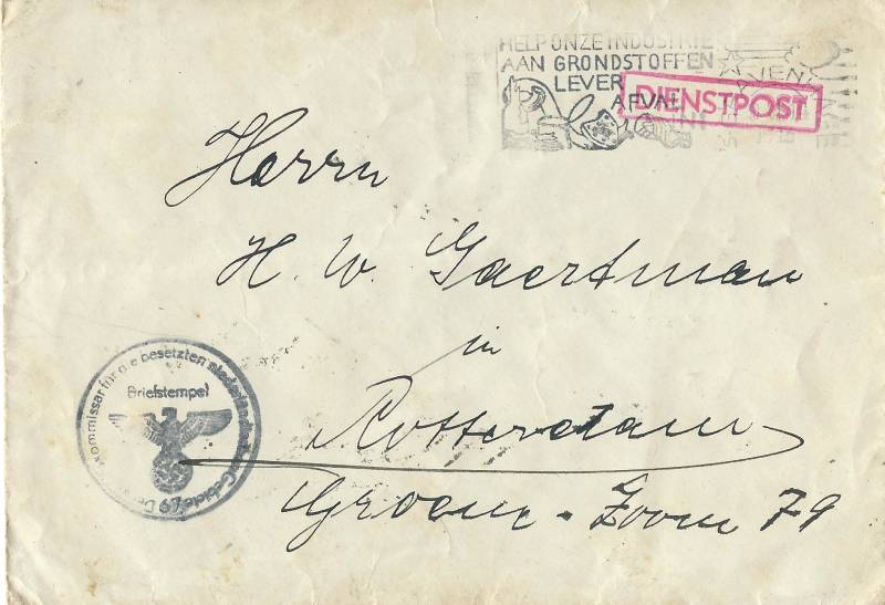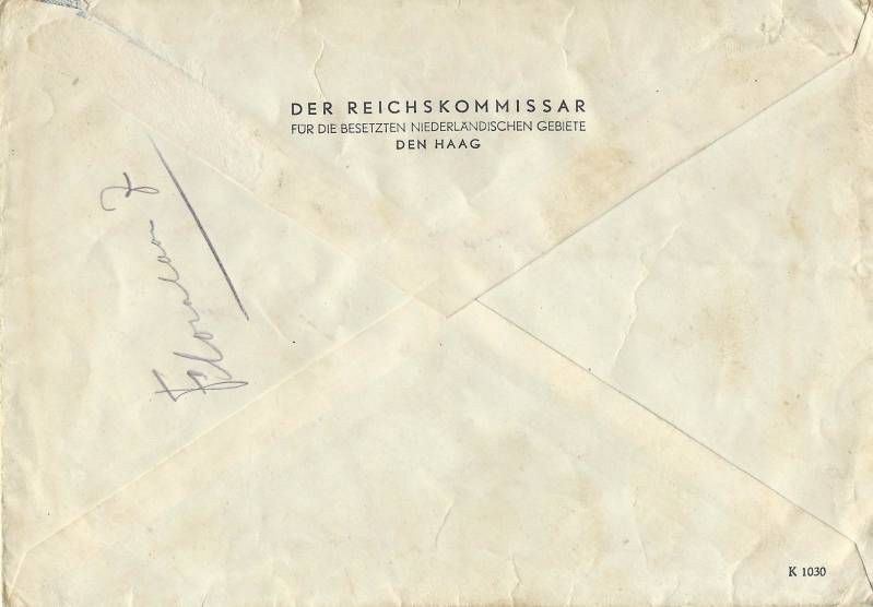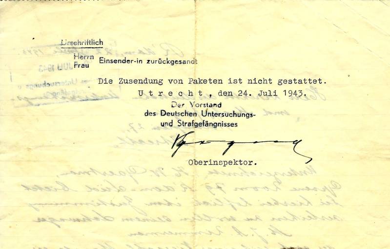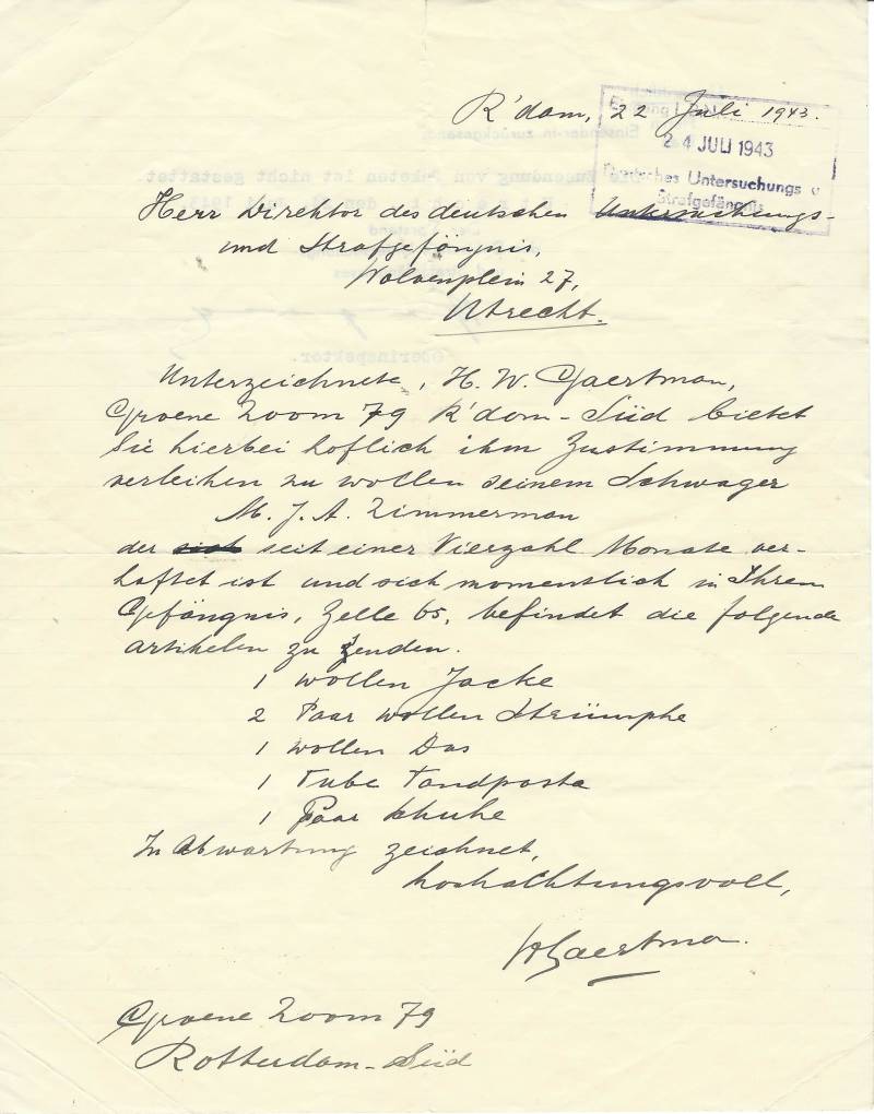 Dit is een brief die mijn vader heeft geschreven op 22 juli 1943 om wat goederen te mogen zenden aan een broer van mijn moeder. Zoals blijkt werd dit niet toegestaan.